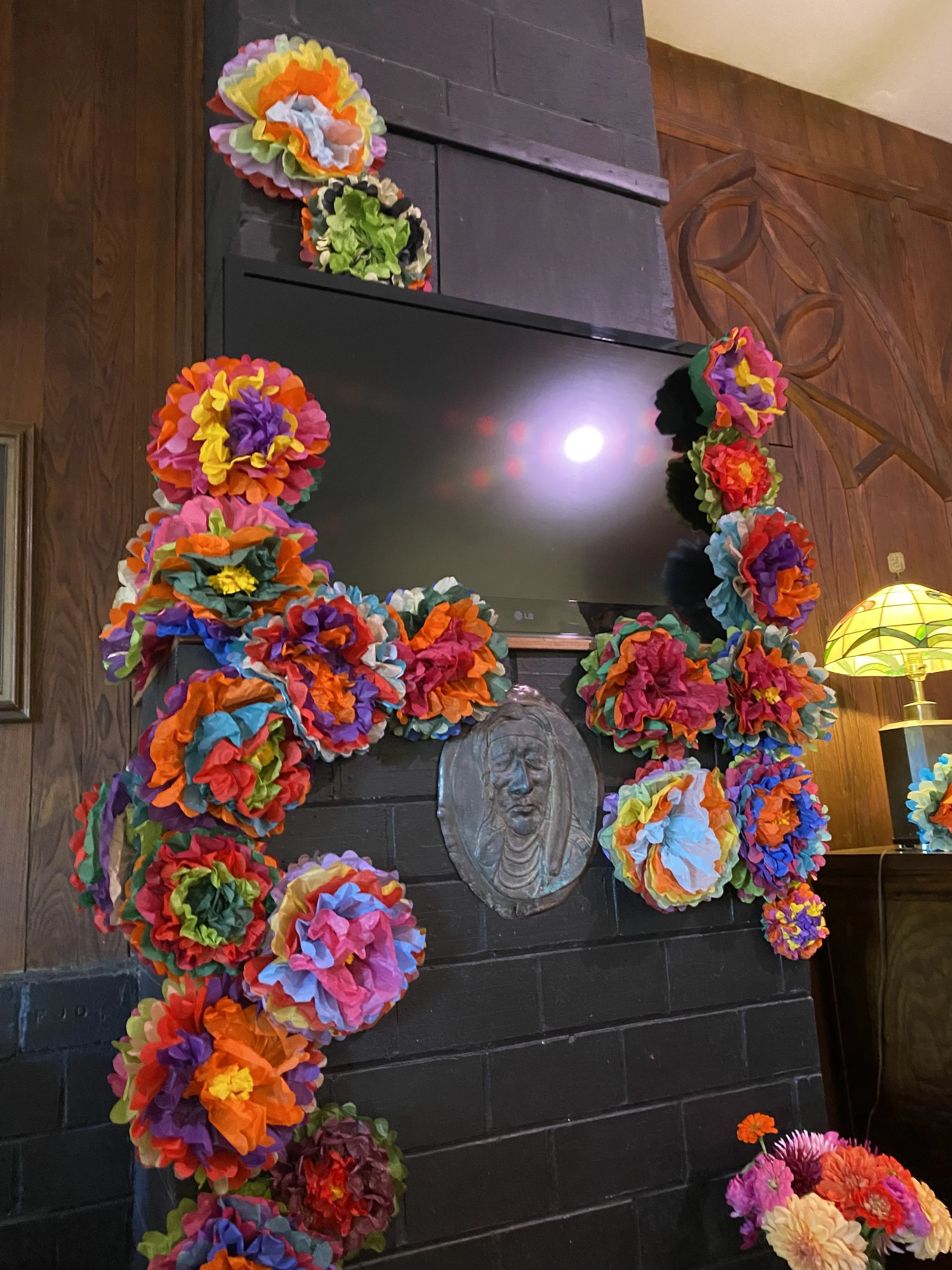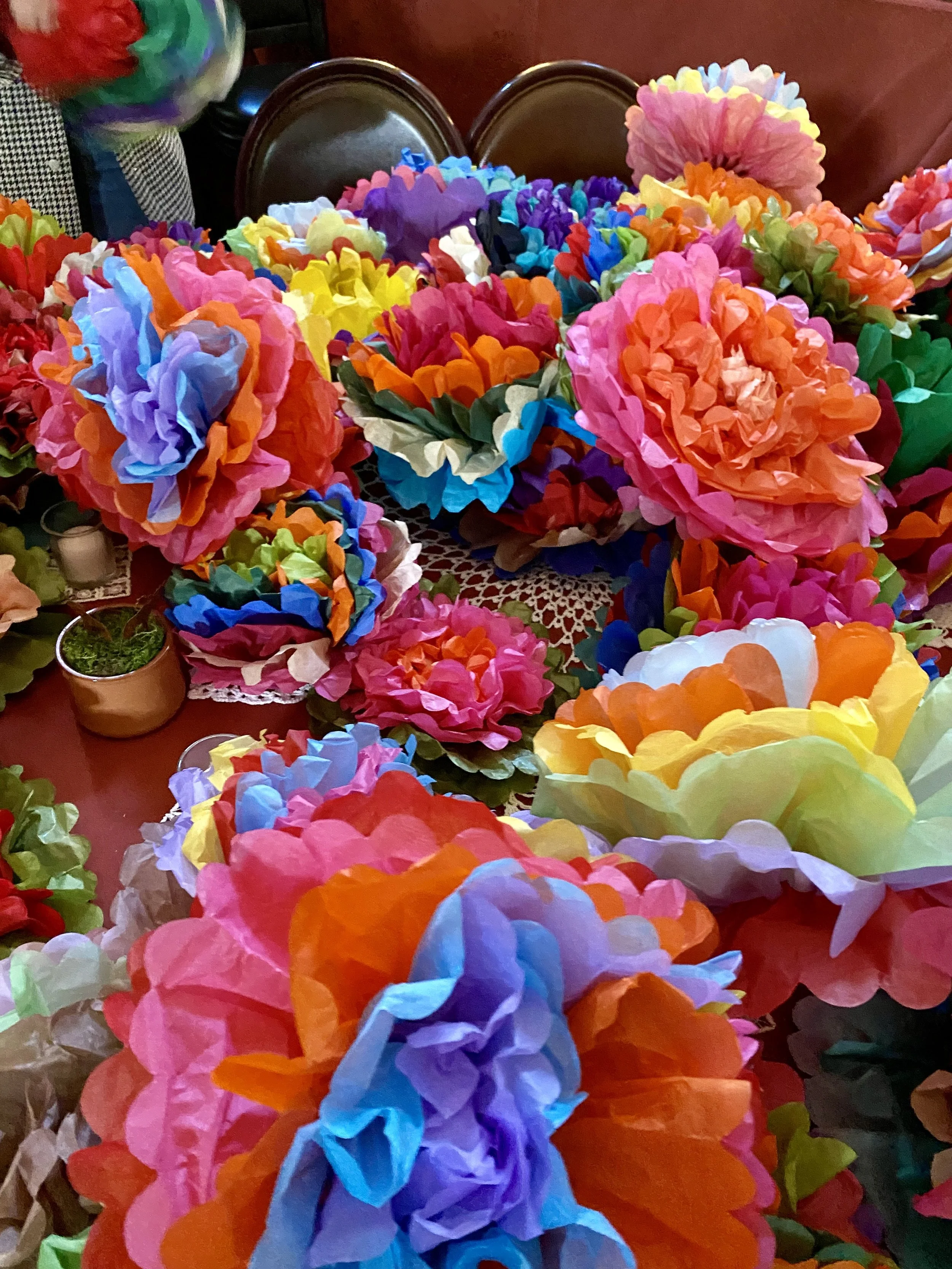 Recently for another friend’s wedding, I made 225 tissue paper flowers similar to those made in Mexico. These beautiful and vibrant flowers are easy to make and brighten up even the darkest of spaces. I combined a variety of tissue paper colors in a fan shape and actually had no idea how they would turn out until the day before the wedding. It was fun “opening up the flowers” with the bride’s sisters and close female friends as we set up for the wedding. Even though we had plenty of live flowers to arrange as well, I think the tissue paper flowers ended up getting all the attention.