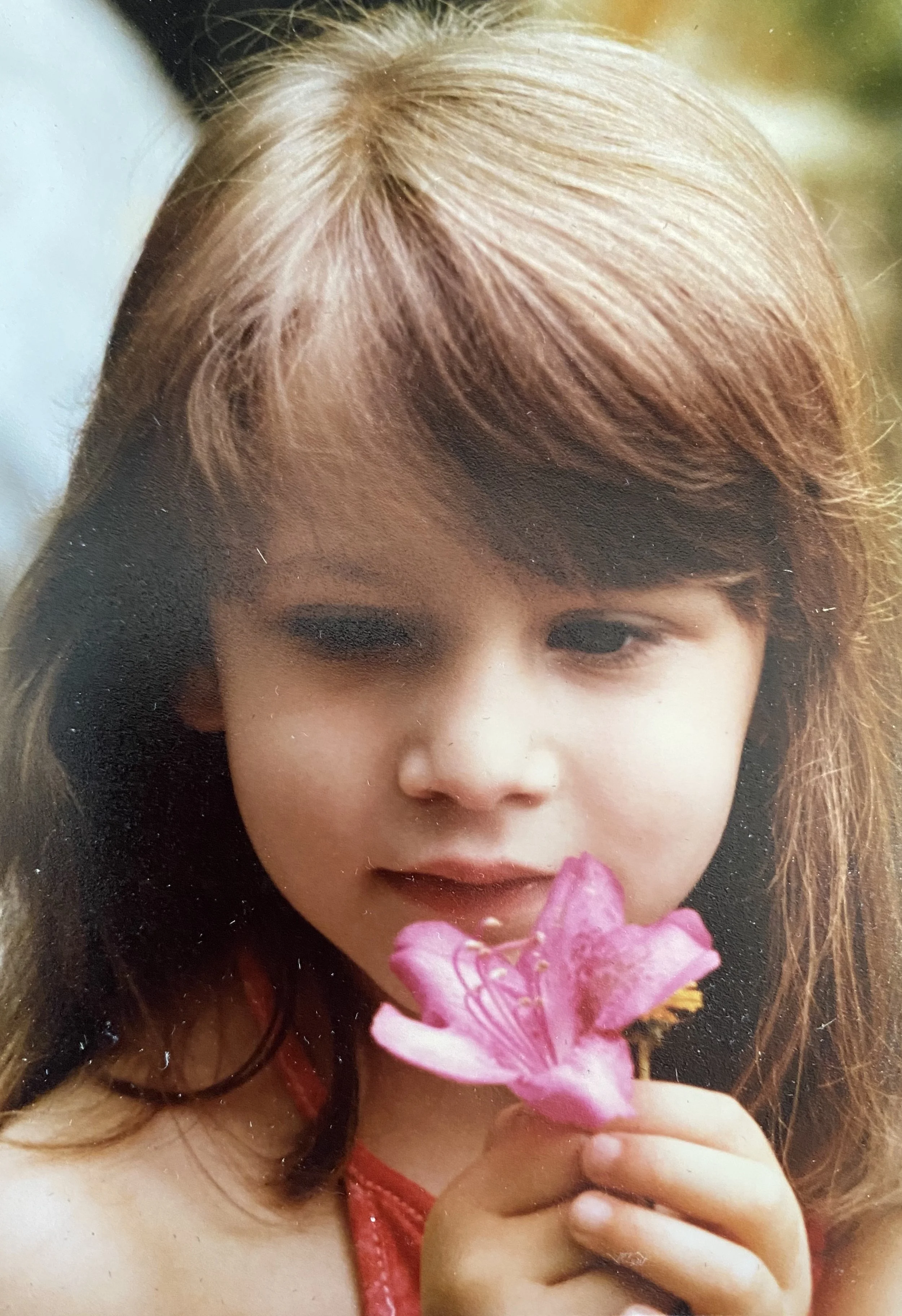 What a great question! As is probably the case for many people, flowers were a presence in my childhood, albeit for me, they were a quiet presence. Flowers appear as secondary players in my drawings, as adornments on my dresses, and tucked behind my ear in faded photographs. Like many children in the 1970s, I pressed flowers in books, made dandelion chains, and made flower “potions” in the listless hours I spent in my yard engrossed in imaginative play.