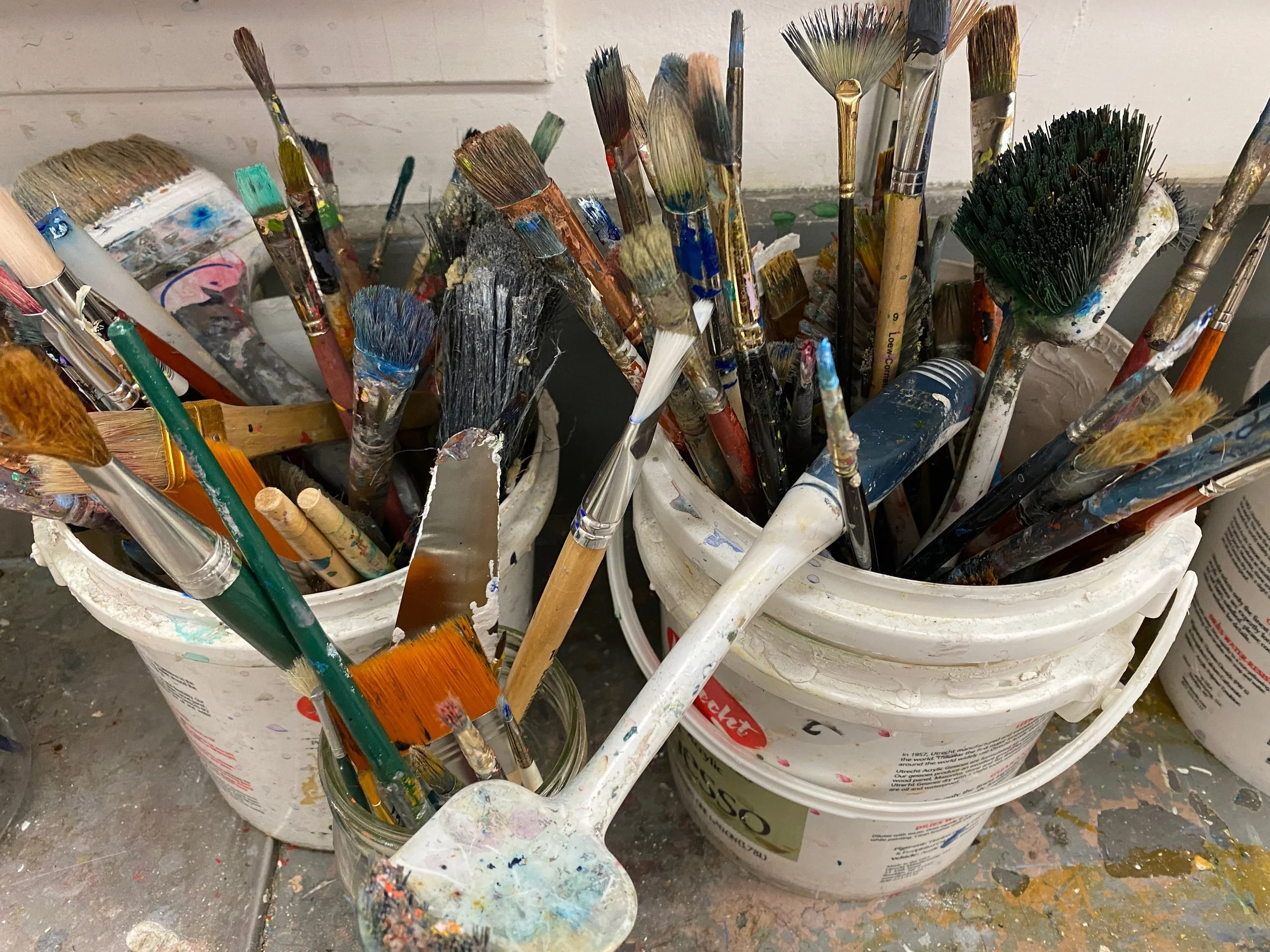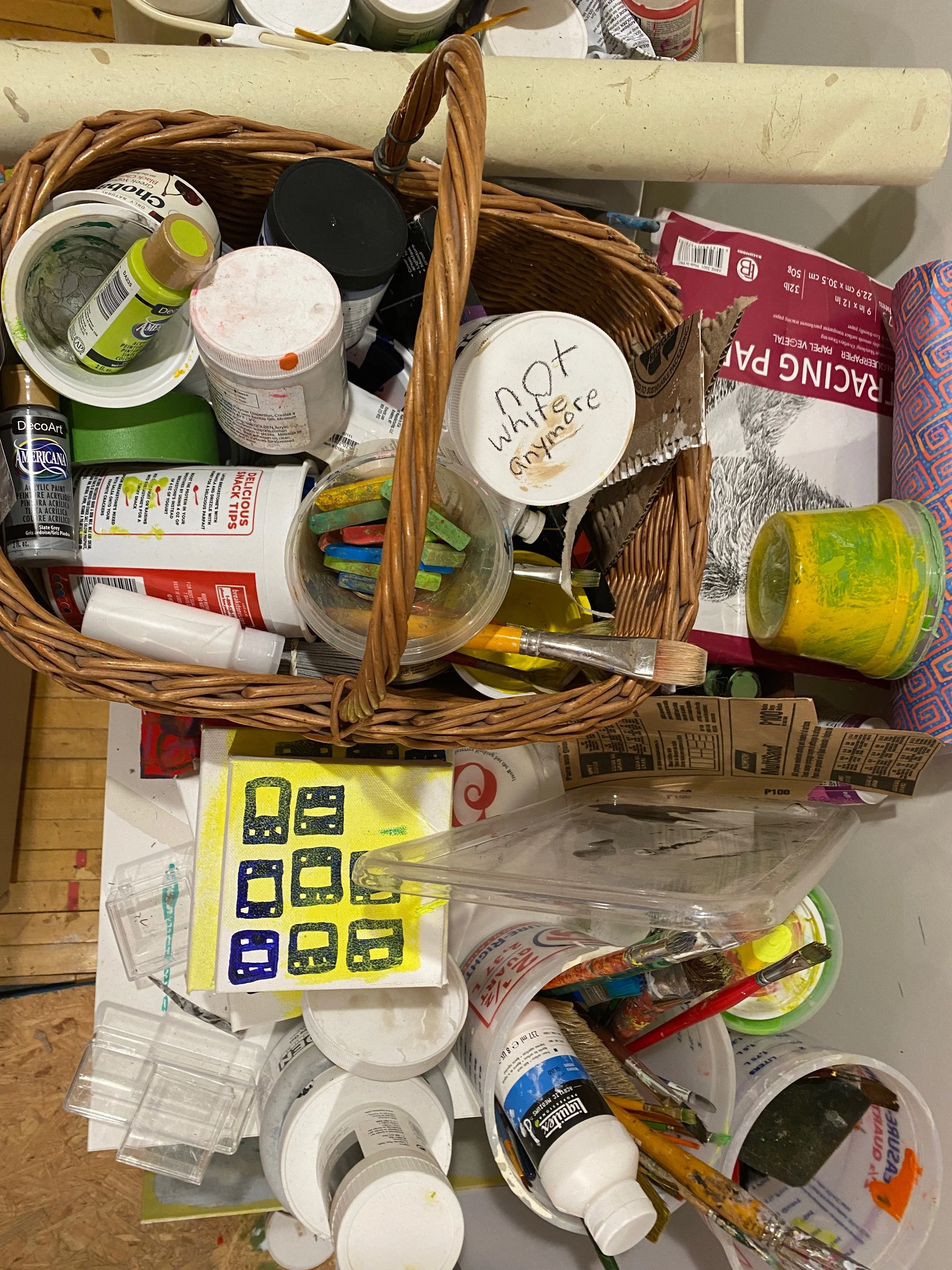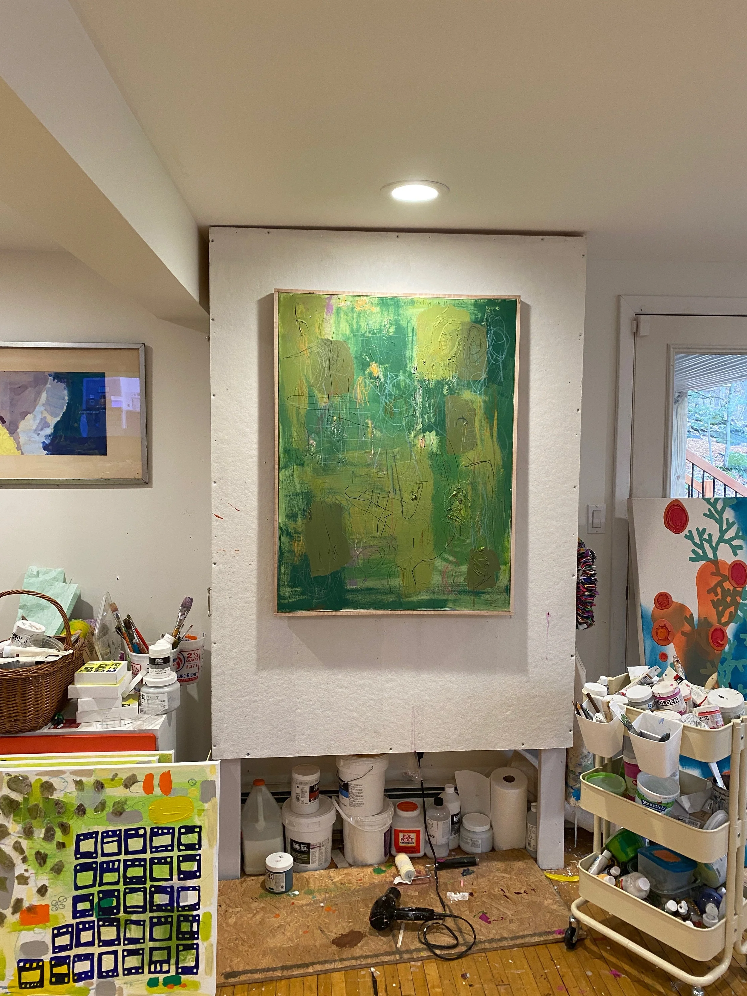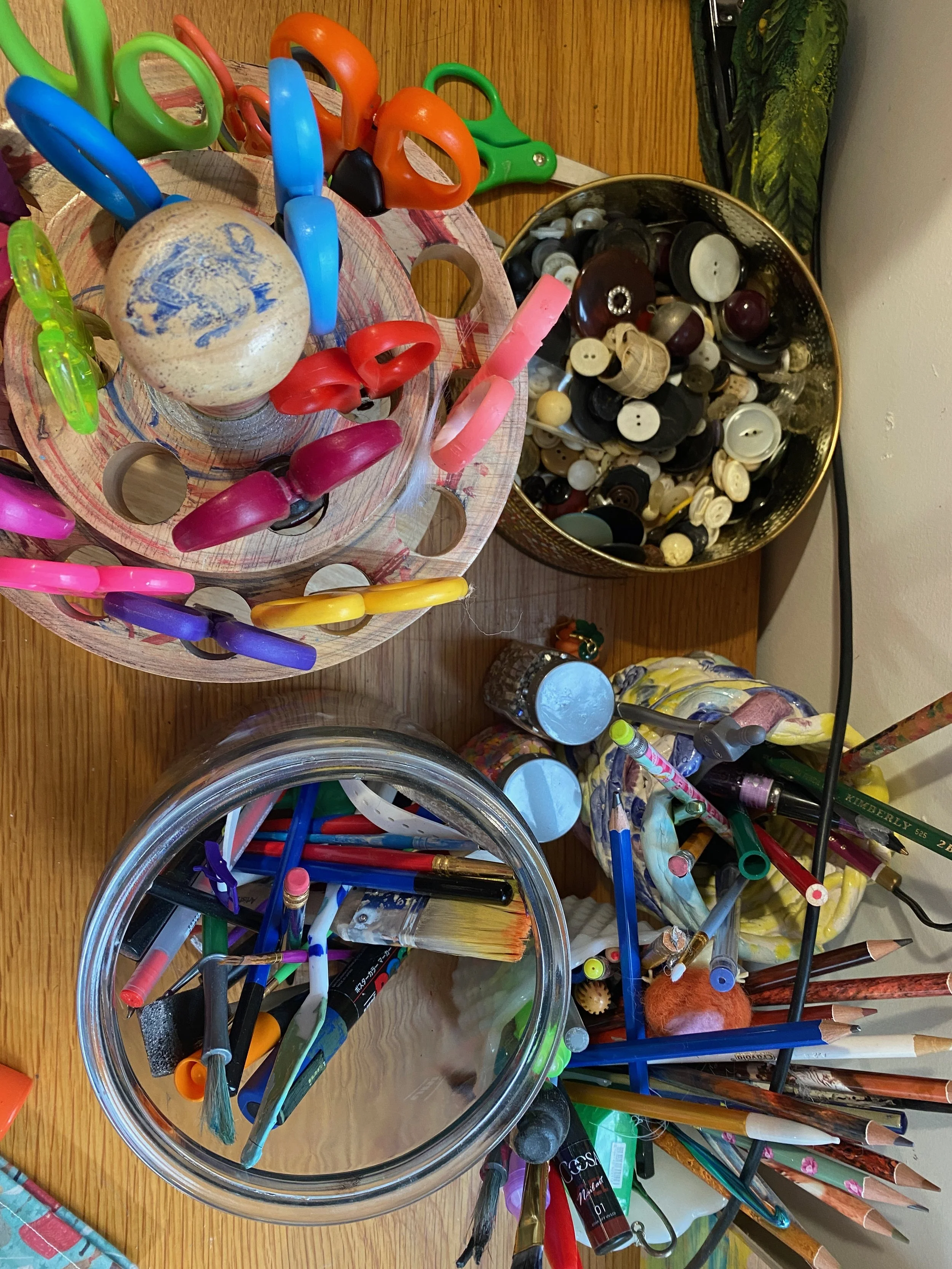 My workspaces have changed so much over the years from my bed, to kitchen counters, to the floor by kids’ cribs, to now sharing an art studio space with my children and husband. I am definitely flexible with where I work! My professional workspace is also an art studio and so I am often transporting projects back and forth between two spaces.