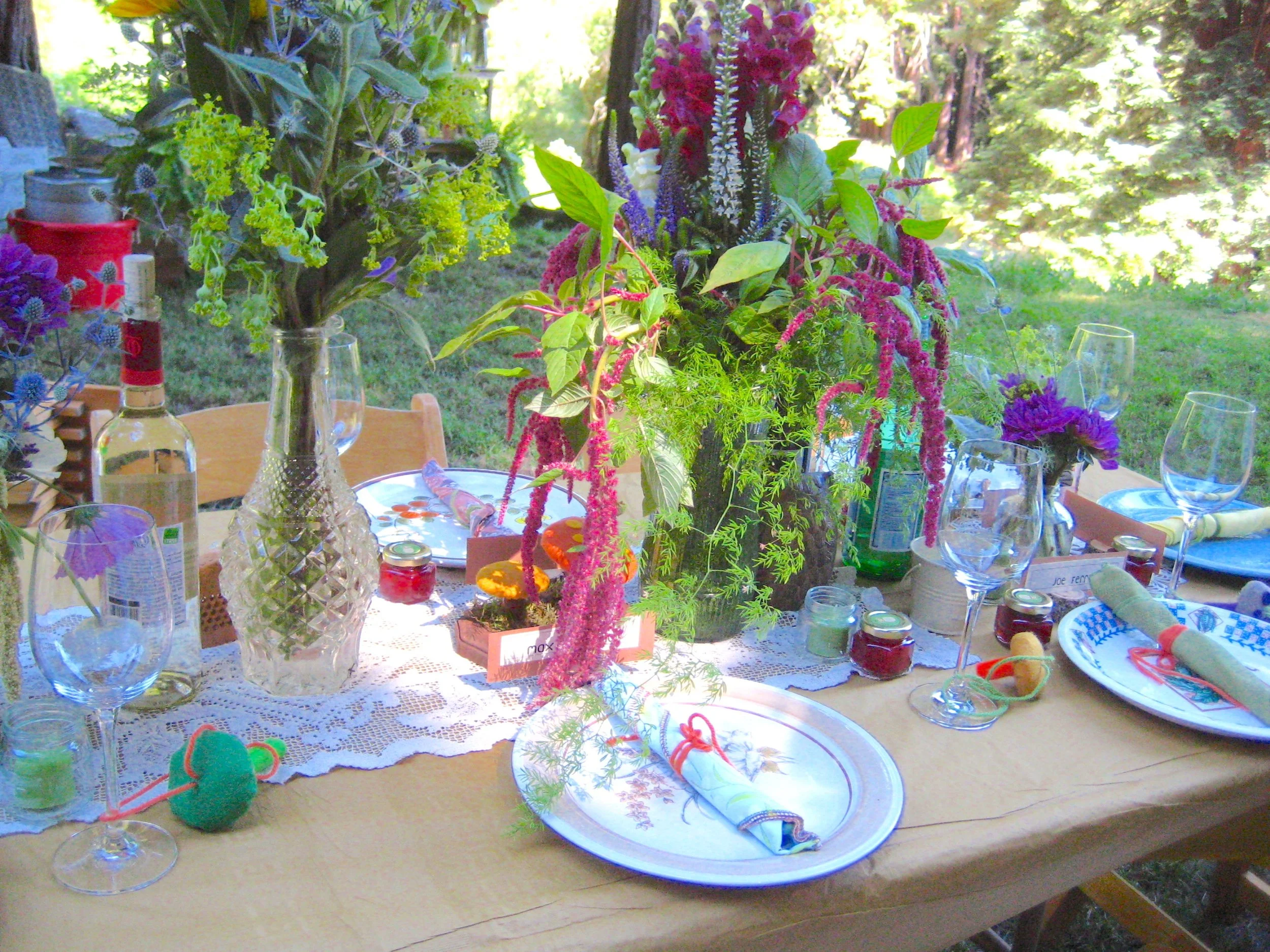 We wanted to go with what was seasonal and native to the Santa Cruz Mountains, where we lived at the time. Each table was named after a native botanical, which also made things fun for our out-of-town guests who’d traveled to be there with us for the weekend. One of the biggest challenges was the sheer prep of it all and trying to keep all of the outdoor arrangements fresh-looking in the June heat, but fortunately nothing was really affected all that much!