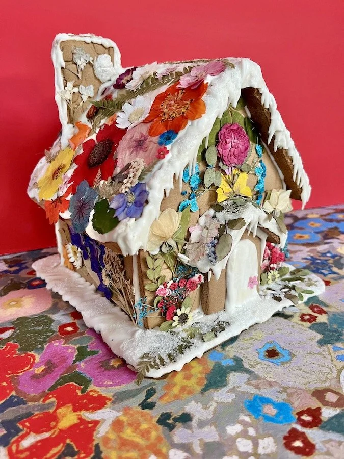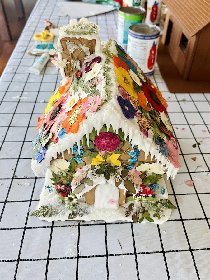 Use one from a kit, buy one that’s already pre-made and constructed for you, or bake one from scratch–whatever you’d like! Alternatively, you could purchase a “forever” gingerbread house like this or a set of cardboard ones for group use like these or these, if you want to skip the whole cookie part of it all.Pressed flowers