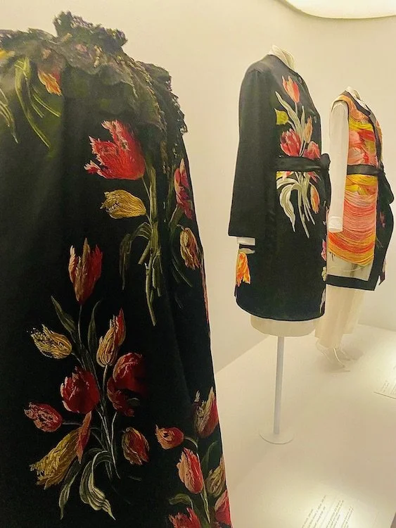 Of these garments and accessories, the centerpiece of the show is 50 rarely-seen garments that are so extremely fragile they can no longer be shown in a traditional form on mannequins. The show’s “Sleeping Beauties” moniker describes the presentation of these historic artifacts, as they’re presented lying down in glass cases with fabric sprawled out, allowing visitors to see their various forms of deterioration. Through the use of accompanying technology including light projection, CGI, and video animation, attendees are given a broader context of each of these pieces.